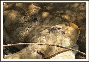 General observation showed poor body condition (body score 1 on a scale of 1-5). There were infected wounds on the lateral aspect of right hind leg and medial aspect of the left hind leg. Right hip joint subluxation was also observed. These injuries are thought to have been sustained in a buffalo attack.