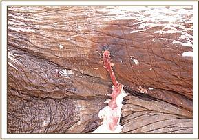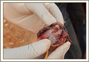 This animal was in poor body condition and could not stand up even after assistance. She died a few minutes later from massive septicemia.