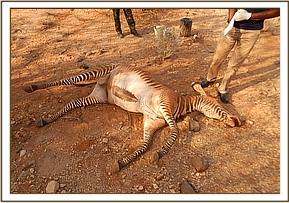 This Grevy’s zebra was reported to have been recumbent for at least 24 hours and showed paralysis of the hind limbs with no apparent injuries. Scouts from the Grevys’ Zebra Trust in Laisamis requested for treatment of this animal which had not shown signs of illness prior to its recumbency. We visited this area on 1st September and found that the zebra had died earlier that day. A post mortem examination of the carcass was conducted to determine the cause of death.