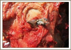 - Ischemic necrosis and fracture affecting the femoral head and muscles of the right hind limb was observed