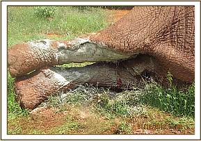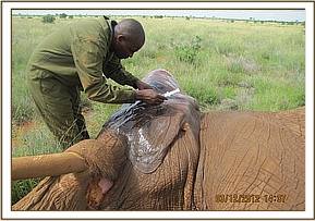 Satao camp is an important watering area for large Elephant bulls that inhabit the eastern boundary of the park. They are oftenly targeted by poachers using poisoned arrows. The huge bull was seen unusually in the same area for days without moving far. Closer observation revealed a huge wound on the side of the body. Darting was done using 18 mgs of etorphine alone. Large chanks of dead tissues were cut off and copious amounts of pus drained. Hydrogen peroxide and iodine was used to clean the wound. A final coat of green clay used to cover the injury. After anaesthetic reversal, he was unable to lift up necessitating assistance. The bull hit the Vet unit vehicle several times after being assisted to its feet but caused little damage to the vehicle.The wound is expected to heal.