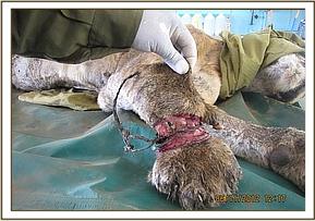 Examination and management of a snared lion from Lamu region, 6th Nov. The lioness was brought to Tsavo research centre with a severe snare wound that cut through to the bones on the left foreleg. The lioness was trapped after preying on small stock occasioned by the severe leg injury. With very poor body condition and the severe injury, the lioness was found unable to survive in the wild and euthanasia was administered. Autopsy also revealed massive internal parasitaemia. The lioness must have survived the initial snaring but with the tight wire around the wrist, hunting was made impossible hence loss in body condition.