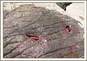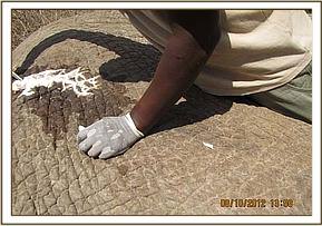 Many adult bulls with huge tusks find their way to this watering hole bearing injuries. The bull was observed with a wound on the abdomen. Darting was done using 18 mgs of etorphine alone. A tractor had to be used to roll him over after it fell on the injured side. The arrow like wounds were washed clean with antimicrobials and antibiotics administered. Prognosis- Good
