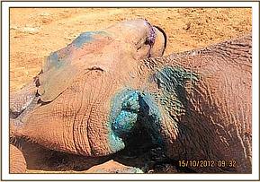 Treatment of a speared Elephant bull at Amboseli, 19th Oct. The community around Amboseli has been hostile towards wildlife of recent and cases of elephants of spearing are thought to be caused by the hostility. This huge bull was spotted by Elephant trust with several wounds on the body and neck oozing pus. He was darted using 18 mgs of etorphine and went into sternal recumbency in 5 minutes, after being pulled over deep wounds in the neck, abdominal area, perineal area and the flank. The wounds were cleaned with hydrogen peroxide, doused with iodine and a final coat of green clay applied. Another huge tusker with a spear wound on the trunk was not attended to as it was in musth. Prognosis- wounds are expected to heal.