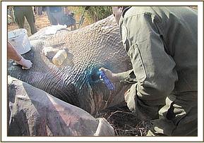 Immobilization was done using 16 mgs of Etorphine propelled using Dan Inject dart system from a vehicle. He was separated from the family and assisted to fall on the left side. An incision was made at the most ventral area of the large gaping hole left by an arrow head.