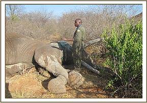 The bull was immobilized using 18 mgs of Etorphine in a Dan Inject dart system. He moved away and fell down about 500 meters away. The two holes on the left flank were opened with a clean surgical knife and followed deep into the intercostal muscles which complicated any meaningful surgical intervention.