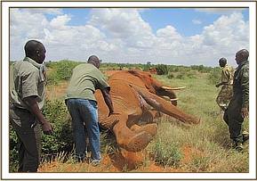 Rukinga Ranch borders the park on the south western side and forms a good dispersal area of the Tsavo East elephants. This case was reported by Rukinga Rangers and the vet team rushed in to find the weak lame elephant cow beside a water hole. She tried to move away with difficulty.