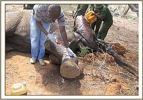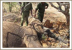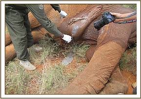 Immobilization was done using 18 mgs of Etorphine propelled in a Dan Inject dart system on foot. Mshale did not move much and fell on the left flank leaving the deep gaping wound on the shoulder and the right ear flap exposed. Two deep penetrating wounds suspected to have been caused by two separate spears were observed. The first wound went through the right ear flap and into the right side of the neck with the second hitting his back, behind the right scapular and deep into the serratus muscles.