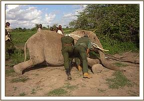The following day, the Amboseli Elephant Research reported a two months old elephant calf from the PC family whose mother had been poached in Tanzania for its long tusks. It had lost body condition and was observed trying to suckle its non lactating sisters and aunts. They called Nairobi to rescue and safe it from imminent death. Nairobi subsequently sent an aircraft to pick me in Voi for the operation. But unfortunately by the time we arrived, the family had retreated deep into an expansive swampy Sodom’s Apple bush completely inaccessible by whatever means. The only alternative was to wait for them to come out, which they did at 6.20pm when the aircraft had already gone back to Nairobi. We darted it at 6.21pm and loaded it into a pick up truck at 6.30pm. We held it overnight in a room at the park headquarters staff quarters and airlifted it to Nairobi the following morning. It however died two days after the rescue.