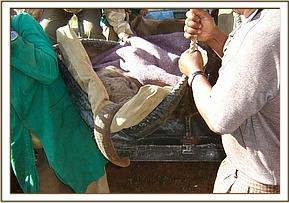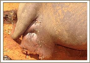 On the 25th, we were called to Bachuma in Tsavo East for a female buffalo with prolapsed vagina and cervix. Most of such cases occur in the last two months of gestation and advanced pregnancy accentuates the condition. Thrombosis, ulceration, necrosis and injury to the affected organ had already occurred. The resultant irritation was causing expulsive straining efforts. This would in turn have increased the degree of prolapse and infection leading to toxaemia, more severe straining, deterioration of body condition and even death. The management of the condition is intensive and entails among other things replacement and retention with strong nylon sutures, frequent doses of systemic antibiotics, and close observation for recurrence, and is not always successful like in the present case where there was excessive trauma which would have led to much irritation and infection with consequent vigorous straining that would dislodge the retaining sutures and the prolapse would recur.
