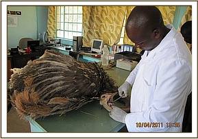 AUTOPSY ON AN OSTRICH CARCASS, 10TH APRIL AT TSAVO EAST RESEARCH STATION.