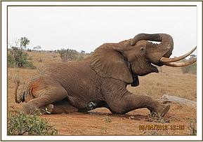 Treatment of a lame Elephant bull in Komboyo Tsavo West, 6th April This case of a big male elephant reported to be lame within Tsavo West was attended on 6th April with suspected leg injuries. Darting was done using 18 mgs of etorphine alone in a dan inject dart gun. It went down within 8 minutes on which thorough examination of the injured leg revealed an old wound that healed poorly. No other injuries were observed. Symptomatic treatment with flunixine meglumine was administered and given good prognosis.