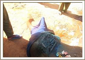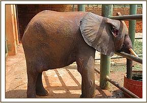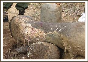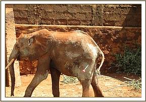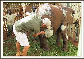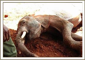 The orphan together with other orphans being raised at the Voi stockade were attacked and injured by a lions on a rainy evening near the stockade. One orphan christened shimba sustained serious injuries on the face and body. He was treated earlier but required repeat treatment as the wounds were turning septic. He was immobilized using 4 mgs of etorphine and the wound cleaned thoroughly by use of water mixed in hydrogen peroxide, dead tissues removed and hydrogen peroxide and oxytetracycline spray applied. The wounds on the face and inquinal area were most severe.