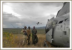 Search and management of a snared Rhino in Mukururo, Chyulu National Park, April 2013.