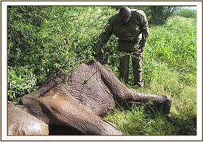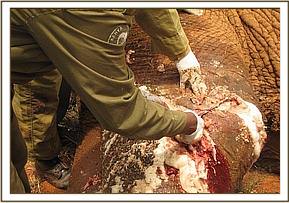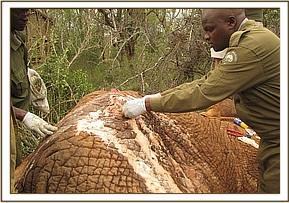 Immobilization was done using 18 mgs of Etorphine and the elephant easily went down in a few minutes. Several arrows were removed from the right side of the body, wounds cleaned with hydrogen peroxide, doused with tincture of Iodine and covered with green clay. A tractor was used to flip him over so that the injuries on the left side could be accessed. The same procedure was also done on the left side.