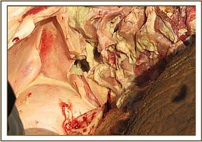 After euthanasia, autopsy revealed massive suppurative nephritis that had spread along the vertebral column. The massive pockets of pus could rapture internally leading to severe fatal peritonitis.