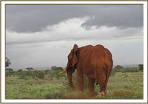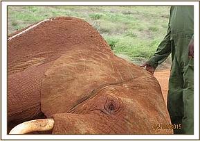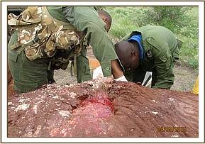 The DSWT aircraft patrolling the northern sector of Tsavo east spotted five elephant bulls and among them was one injured bull with pus oozing from an injury on the right side of the abdominal wall. The team rushed to the area to find the injured bull still within the vicinity.