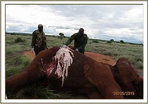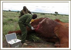 There was a reduction in cases this month due to improved security and the start of the rainy season which increases vegetation and water points thereby reducing human wildlife conflict. Tsavo Vet Unit were on leave for the majority of the month and many cases were handled by the Amboseli vet unit. The unit rescued an orphaned Buffalo calf from Lualenyi Ranch and brought it to Voi stockade for care and an elephant bull was treated for an arrow injury in Emusaya area north of Galana River.