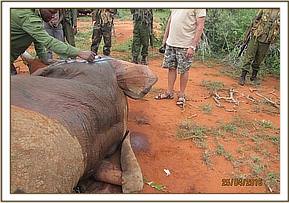 The carcass was lying on the right flank with tusks missing (earlier removed by KWS rangers); there was sign of ante-mortem bleeding on the body surface.