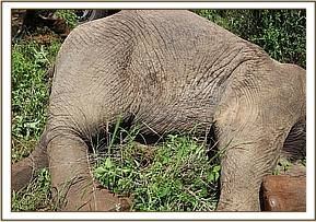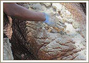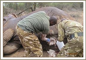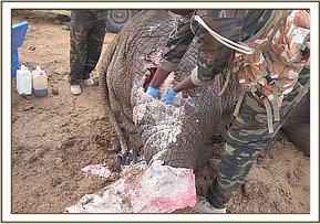 The elephant was approached on foot and darted with 18 mgs of Etorphine in a dan inject dart from a Dan-inject dart gun. The drug took effect in 6 minutes and the elephant went down in left lateral recumbency.