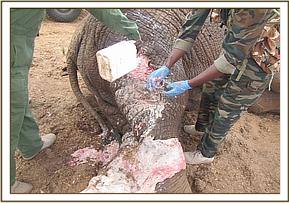 The leg was examined closely by palpation and noted to be broken just below the right knee joint. A complete fracture of the right tibia and fibula was diagnosed and poor prognosis given. A decision to euthanize the elephant was reached to prevent further suffering as it was in an area where it would likely be poached. Autopsy confirmed the grave diagnosis. Tusks were removed and handed to KWS security personnel.