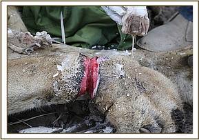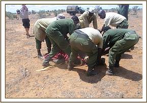 The vet used a dart containing 300 mgs of Ketamine and 4 mgs of Meditomidine to sedate the lion. It took about 12 minutes for the lion to be fully immobilized. The eyes were covered with a towel then the tough nylon snare was cut loose and the wound cleaned using water mixed with Hydrogen Peroxide. Tincture of iodine and Oxytetracycline spray was then applied followed by a coating of green clay.