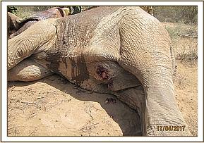 An elephant bull was spotted by Big Life Rangers manning the group ranches surrounding Amboseli National Park. It had a wound to the lower abdomen that was oozing pus and blood. The vet unit rushed to the area and found the bull near Mashenani gate under some bushes.