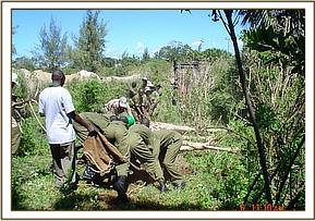 The activities for the month of August started with the translocation of seven adult Rothschild giraffes (6 females and one male) from Bamburi’s Baobab farm (Haller Park) to Nguuni Nature Sanctuary, 5km away. The objective for the translocation was to de-stock Baobab farm from 11 to 4 giraffes because of inadequate browse which had resulted to poor body condition in most of the animals and mortalities in young calves due to malnutrition. This has led to a very low recruitment rate. Nguuni has adequate browse composed mainly of Acacia nilotica species. Lewa Wildlife Conservancy which has a fully fledged capture team had been contracted to do this work. The mobile vet unit was requested to provide assistance on veterinary aspects. The exercise commenced on the 6th when three females were moved. The male and a female were moved on the 7th and the last two females were moved on the 8th.