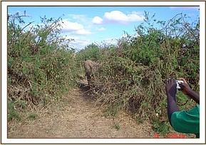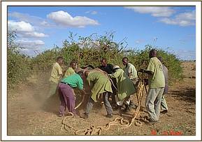 Amboseli national park reported an elephant with two spears still embedded on its head on the 17th. The elephant identified as Odile, the matriarch from the OB family, was on sight and required immediate attention before it retreated back into the swamps. They arranged for me to be airlifted immediately by an aircraft belonging to the Amboseli Elephant Research Project. However, it couldn’t be possible for me to be brought back thus the vehicle had to follow. The elephant was found to have moved deep into Solanum incum (Sodom’s apple) bush near Oldare area by the time we arrived. It took nearly three hours of manoeuvring and aerial support to get to it. The first dart composed of 17mg Etorphine Hcl landed perfectly on the left thigh but the animal did not show any signs of narcotisation. After 25 minutes and still no sign at all, it was given another full dose. On dart impact, it fled into an even thicker bush. The terrain was extremely difficult to effectively herd it to go down in an open area. It went down after about 10 minutes but accessibility proved extremely difficult and it took almost 7 minutes to get to it. The spears, one at the temple and the other at the base of the trunk, were deeply embedded and required several men to pull out.