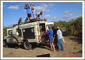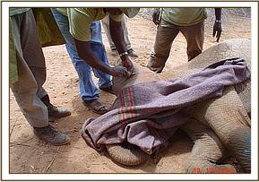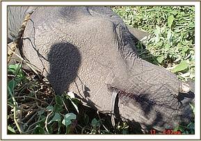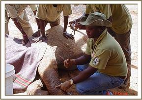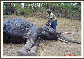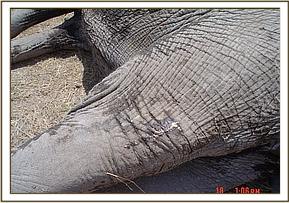 Odile had a family of 14 individuals. It was speared while defending its family against Maasai morrans on a revenge mission on claims that one of their cows had been killed by elephants while watering their animals within the park. It became separated from its family after the incident. Before we left for Tsavo the following day, an aerial survey was done to try and locate the family. Ground searching by vehicle was resorted to facilitate more detailed observation of families seen during the aerial survey. Fortunately, the family was found near the Research camp. One of the cows was observed to have an infected spear wound on its right shoulder but the rest were unharmed. The wound was discharging pus and the animal seemed to be in some pain as it occasionally avoided bearing its full weight on this leg. It also kept on scratching the wound. We decided to treat it in order to arrest the infection before it spread. It was immobilised with 17mg M99® and went down in about 7 minutes on its sternum. We quickly rolled it over onto lateral recumbency to prevent respiratory complications that arise on sternal recumbency. The pus was cleaned out and the wound treated in the same way like the above elephant.