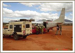 On the afternoon of 14th, the proprietor of King Fisher tented camp near Sala Gate within Tsavo East sighted an elephant calf wandering alone 15km from Sala gate along the Galana River. After ascertaining that there were no other elephants in the area and it was either orphaned or separated from its mother and/or family, he promptly called the unit for rescue. Together with the de-snaring team we responded immediately. The calf was found in the same general area with no other elephants on sight. The age was estimated to be about 15 months but initial report indicated that it was only a few months old. We proceeded with the rescue exercise. It was restrained physically, the legs properly secured, loaded into the vet truck and transported to the Voi orphanage for an overnight stay. It was airlifted to the Nairobi nursery the next day. Reports so far indicate that the calf is doing very well and has already acclimatised.