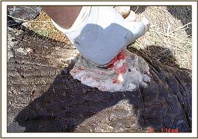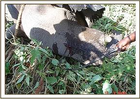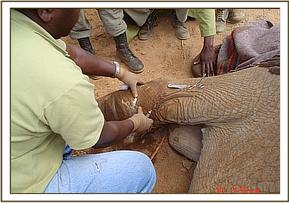 Just before embarking to treat the above elephant, we received a radio message from Voi that Nepasha, an orphan at the Ithumba orphanage, had a piece of stick piercing its left fore leg. The leg had become swollen and painful. We left Amboseli for Voi in the afternoon and proceeded to Ithumba the following day (the 19th). The calf would not allow anybody to touch that leg and physical restraint to facilitate treatment proved futile. The stick was deeply embedded and had no grip to allow its removal without proper restraint. The calf was therefore given 3mg Etorphine Hcl by hand injection to cause mild narcotisation to allow physical restraint and administer treatment. The stick measuring about 2 inches in length was subsequently removed.