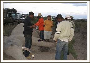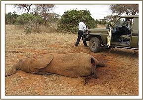 The other was a 35 year old bull with a massively swollen entire right fore leg. It could hardly walk and was spending most of the time lying down. There was no physical injury that was visible but we suspected poisoned arrow made from a nail that is a common method of poisoning elephants in the Tsavos. This type of arrow has no hooks/barbs and is easily pulled out by the elephant upon impact leaving out a very tiny penetrating wound that closes soon after leaving no noticeable mark. Majority of animals injured by poisoned arrows do not survive. The traditional poisons are made from a concoction of herbs and there are no known antidotes. It was recommended that the animal be put down because the condition was beyond any assistance.