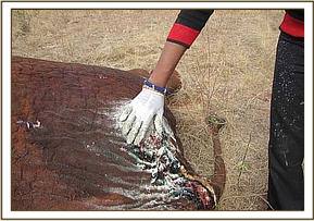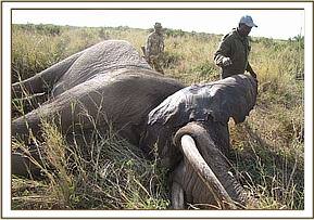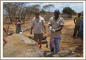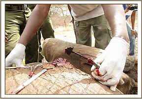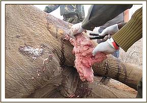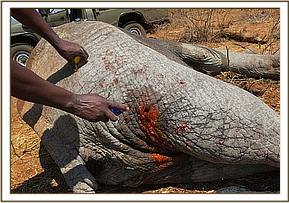 A big tusker bull was treated for an arrow wound on the right abdominal flank near Satao Camp, Tsavo East. An arrow head was retrieved and large amounts of pus was drained by making an incision on the lowest point. Large chunks of necrotic flesh were also cut off before antibiotics and green clay was administered.