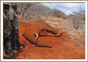The elephant that was reported to be injured was found to be immobile when the unit arrived on the scene. It had sadly collapsed and died before the vet team could treat it. An autopsy revealed pus in the abdominal muscles beneath the skin. Cause of death was septicemia due to an old arrow injury.