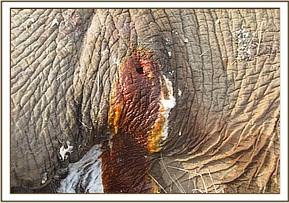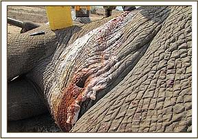 A huge wild elephant bull was treated for an arrow wound near the left knee in theIthumba area of Northern Tsavo East. Large amounts of pus and necrotic flesh were removed leaving a gaping hole on the leg. Full treatment was given before antibiotics were administered and the wound was packed with green clay.