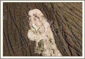 This elephant was treated for a bullet wound on the left hind leg. The wound was deep and some broken bone could be felt. The wound was washed and antibiotics applied. A final cover of green clay was applied. Prognosis is guarded.