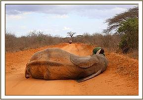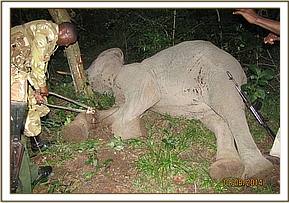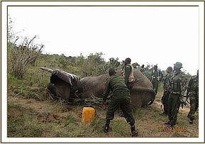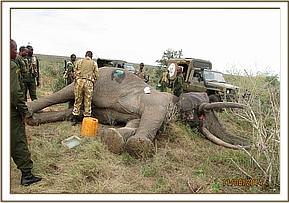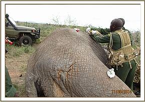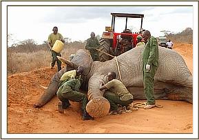 Immobilization, examination and treatment: The elephant fell on the injured side and had to be pulled over in order to expose the injured area. A tractor was used to flip the huge mass but the ropes kept on breaking and only managed to flip the elephant after several attempts. On close check the spear wound was found to have healed and needed no much treatment. The elephant was given dexamethasone to relief capture stress and revived using 60 mgs of diprenorphine intravenously.
