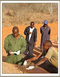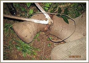 Immobilization, examination and treatment: The elephant was immobilized using 16 mgs of etorphine propelled in a dan inject dart system. He ran into the forest and fell about a hundred metres away. The search was conducted and he was found before darkness fell. The wire snare was cut loose, wounds cleaned with hydrogen peroxide mixed in water and later doused with tincture of iodine. Green clay was used to cover the wound. Injenctable dexamethasone and long acting amoxicillin were administered parenterally. He was revived by administration of 48 mgs of diprenorphine intravenously. Prognosis: Good.