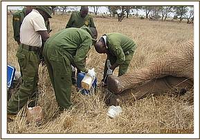 The elephant was immobilized using 18 mgs of Etorphine in a dan-inject dart using a dart gun from a vehicle. He was darted in the rump and went down on the right flank after 9 minutes.There was a penetrating wound to the left chest area caused by a spear with massive accumulation of pus below the wound and extending to the lower abdomen.