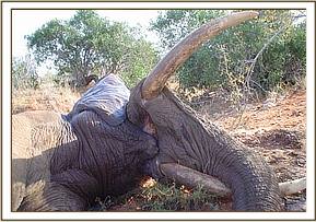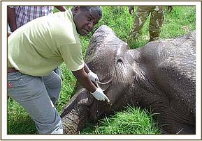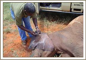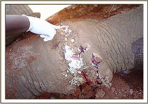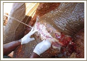 Assessment of Tullip Tulip is the tusk-less female with a penetrating spear wound at the base of the trunk treated in Amboseli in January 2004. Concern had been raised whether the wound had healed because the elephant had been seen occasionally dusting its trunk. From a distance, the wound looked healed with no infection or swelling at the point of injury. However we thought it prudent to immobilise the animal and rule out all doubts. This was done and our observations were confirmed.