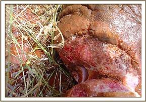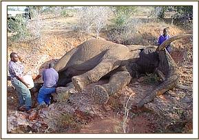 Elephant with snare wound at Sala Gate This was the first case in the month of February. It was reported by the rangers stationed at Sala Gate on 6th February. It was a bull in a herd of seven other bulls. From a distance, we could see a wound and swelling round the lower part of the left hind leg obviously inflicted by a wire snare but we could not tell whether the snare was still there or not. The injury was however not interfering with movement and posture. We decided to immobilise the elephant for a detailed examination of the wound and treatment. Immobilisation was achieved by 19mg M99® but the animal went down in a rocky area. The rocks were pressing onto the abdomen and chest leading to compromised respiration. This required us to act very fast before the animal succumbed to respiratory insufficiency. Examination of the wound did not reveal any foreign object, and the snare must have come out after a prolonged period judging by the extent of the injury and swelling. The wound was cleaned and treated topically. The animal was also given an antibiotic cover of long acting oxytetracycline before it was revived with 60mg M5050®.
