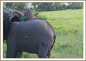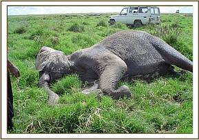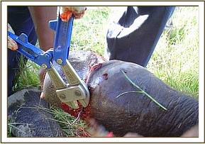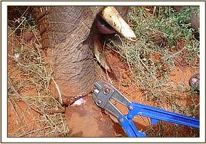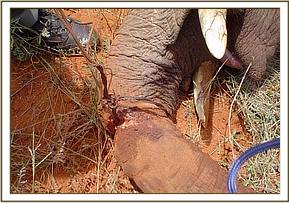 Elephant calf with winch cable snare in Amboseli The calf was aged about two years in a large family of 13. The snare was deeply embedded and required radical surgery to reach and remove it. It was a long standing case judging by the extent of the swelling and the fact that healing had taken place over the snare and only a small portion was exposed at the back. Topical and systemic long acting antibiotics were also administered. The calf was revived and rejoined with its group.