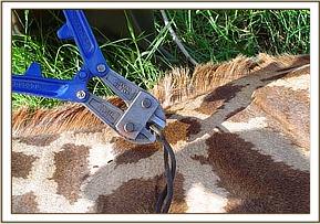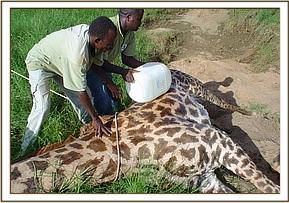Giraffe with winch cable snare near Satao Camp The snare was hanging loosely round the neck; no wound had been inflicted. It was immobilised with 12mg M99® and 20mg Xylazine Hcl. Its flight distance was long occasioning lose of two darts. The third dart landed on the shoulder but the animal became only slightly sedated due to incomplete discharge of the dart. It was given a fourth dart of the same amount after about 20 minutes which made it sufficiently sedated to be roped down. The head was held down and M5050® and Antisedan® were administered immediately it went down to antagonise the two drugs respectively. Long acting oxytetracycline was administered and the snare was removed. The whole process was done very fast and was complete in less than 10 minutes. The animal was then given time to stand on its own.