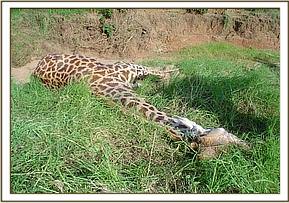 Wounded Cheetah The cheetah was treated on 10th January and had last been seen on the 13th January. It had a big laceration on its left hip area which was sutured with chromic cat gut. It also had a superficial wound at the abdominal area that involved the top layer of the skin only. The laceration had apposed nicely when it was sighted last. It was again seen on the 22nd February weak and hungry and we decided to provide it with some meat. The wound was observed to have healed and only a small portion of the laceration probably resulting from suture dehiscence was remaining to appose completely.
