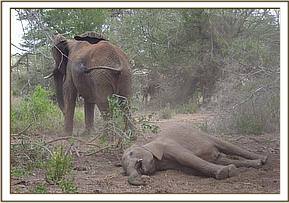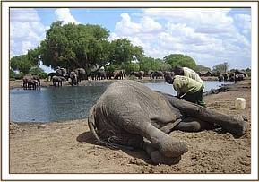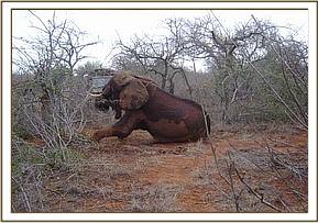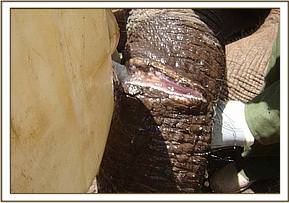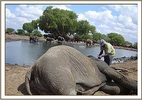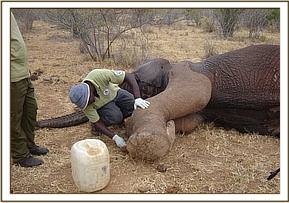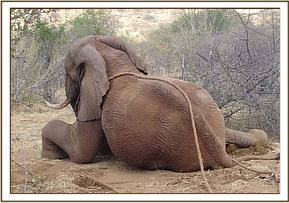 There was a report of another injured bull elephant at Sopa Lodge outside the park brought in by community game scouts when we were treating the above calf. The rangers managed to track it down by foot and confirmed to us that the injury was minor, and required no treatment.