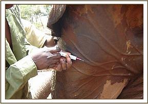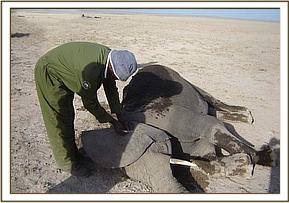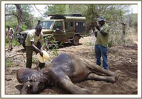 Activities for February started on the 2nd with a report of an injured bull elephant at Maji Chumvi in Tsavo East. The lower left fore leg was very swollen and the animal was walking with a lot of difficulty. Darting was done on foot because the area had thick bushes and difficult terrain to approach by vehicle. On immobilisation and upon examination, we concluded that a bullet must have caused the injury, as it was very narrow and penetrated deep. Though the injury looked long standing from the extent of the swelling, it was not infected and only flank blood came out when probed.