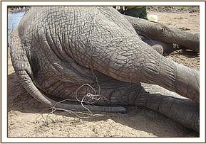 Before the two cases on the 14th, we had the previous day removed a snare from a bull elephant at Satao camp in Tsavo East. The snare was long and trailing but it had not inflicted any injury.