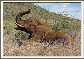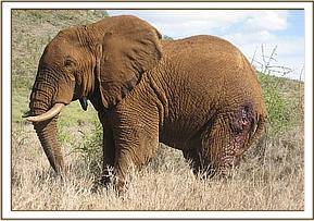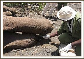 Although difficult to determine the cause, we thought it was inflicted by an arrow. Injuries of elephants with arrows made from nails and without hooks are not uncommon in Amboseli. The arrows which are at times poisonous are easily plucked out by the elephant and leave very narrow penetrating wounds that may not be easily noticed until complications set in. Both injuries like in the first elephant were fresh and no infection had started to set in. they were cleaned and treated topically and intramuscular antibiotic cover administered. The prognosis for recovery seemed better than for the juvenile elephant. Both animals were also given an anti-inflammatory drug (Dexamethasone) injection. They will be monitored closely and updates relayed to relevant authorities.