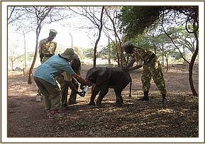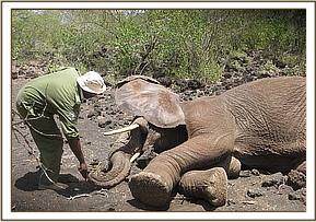 A two and half year old elephant calf was reported wandering alone at Ziwani farm next to Tsavo West with no other elephants in sight. However, we found it down and unable to stand up and was euthanised with 30ml 20% pentobarbital sodium. Another one year old calf was also put down after it failed progressively became weak and failed to stand up at the Voi elephant stockades. The calf had survived a bus accident at Bachuma area in Tsavo East in which two other elephants died.